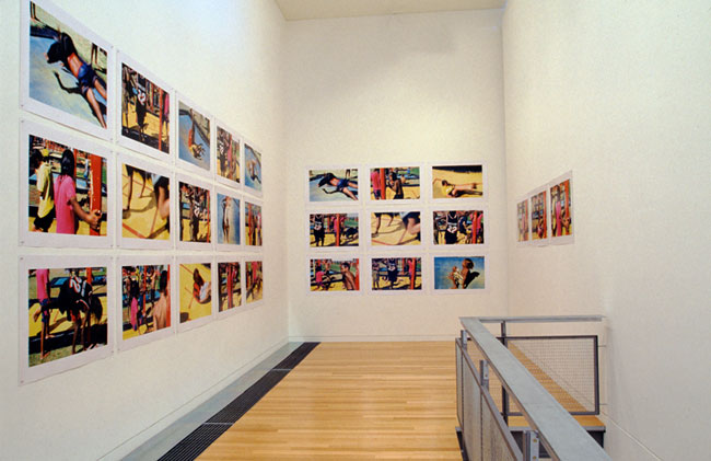 Pool is a suite of 28 photographic prints (each print 78.0cm x 108.0cm) taken at the local Alice Springs municipal pool during the summer months of January - March 1999. Pool celebrates the vibrancy and agency of Aboriginal life worlds, the currency and vitality of culture in situ. By using colour and rhythm, motion and stasis, pattern and repetition, identity politics are examined and performed through the physicality of bodies, shapes, and gravity. Their arrangement and re-arrangement, in motion or stilled, in-frame and out-of-frame, signify performative gestures of strength, tenacity, agility and resilience—those qualities associated with resistance and survival. The body becomes a contemporary palimpsest re-inscribing itself into place—claiming legitimacy, visibility, prominence and representation. The body as inscriptive surface, historical site-marker, and sensual proof, is re-written into space and time and situated within the specificity of location. A tacit narrative of place and people is told through a framework of physical presence, performative gesture, and the arrangement of colour and shape.